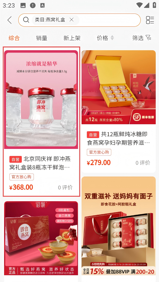 4、筛选商品功能:支持按销量、新上架、价格等条件筛选商品,精准查找目标燕窝,提升选购效率。