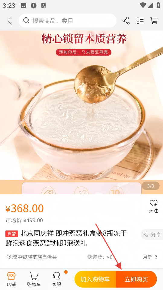 1、购买商品功能:选中心仪燕窝商品后,可直接在线提交订单并完成支付,快速完成商品购买操作。
