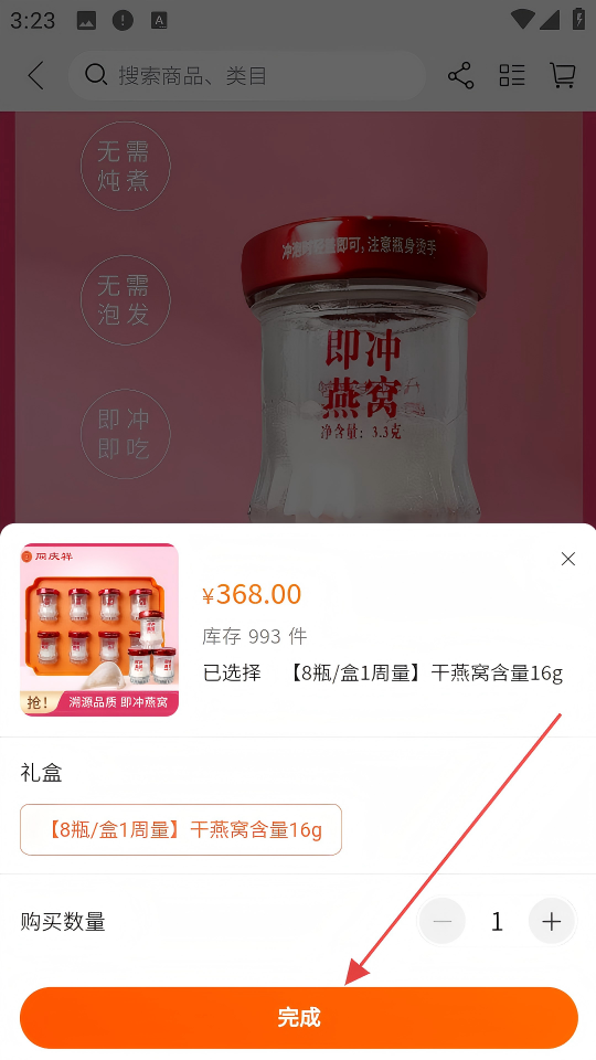 2、在商品列表中,选择想要购买的燕窝礼盒商品,点击进入商品详情页。