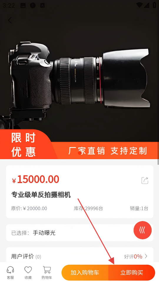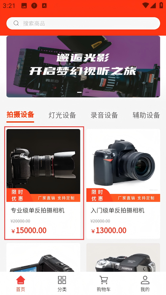 1、在首页“拍摄设备”分类下,点击【专业级单反拍摄相机】,进入该商品详情页面。