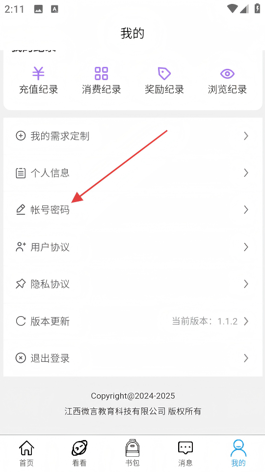 2、在“我的”页面,点击【帐号密码】选项,进入帐号密码设置页面。