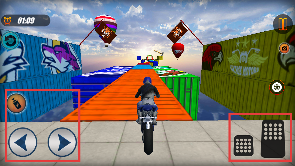 1、进入游戏,利用左下角【方向】按钮操控摩托,右侧【加速】和【减速】按钮控制车速,留意左上角的倒计时。
