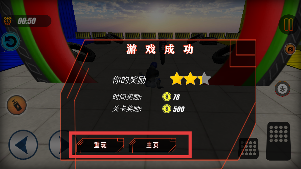 4、冲线后若显示【游戏成功】,查看【时间奖励】【关卡奖励】,可点击【重玩】挑战或【主页】返回。
