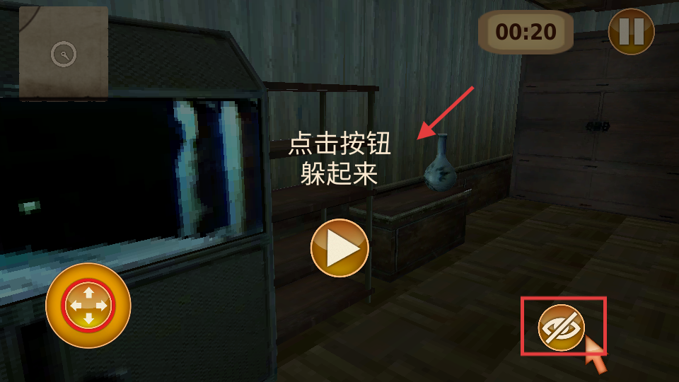 2、危险临近时,点击右下角带闭眼图标的按钮,可快速躲起来,规避伪人侦察。