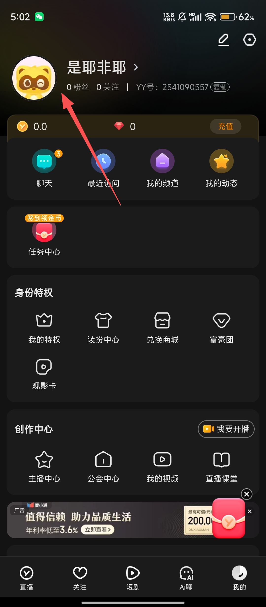 1、打开YY直播,点底部【我的】,进入个人页面,开启账号修改的第一步哦。