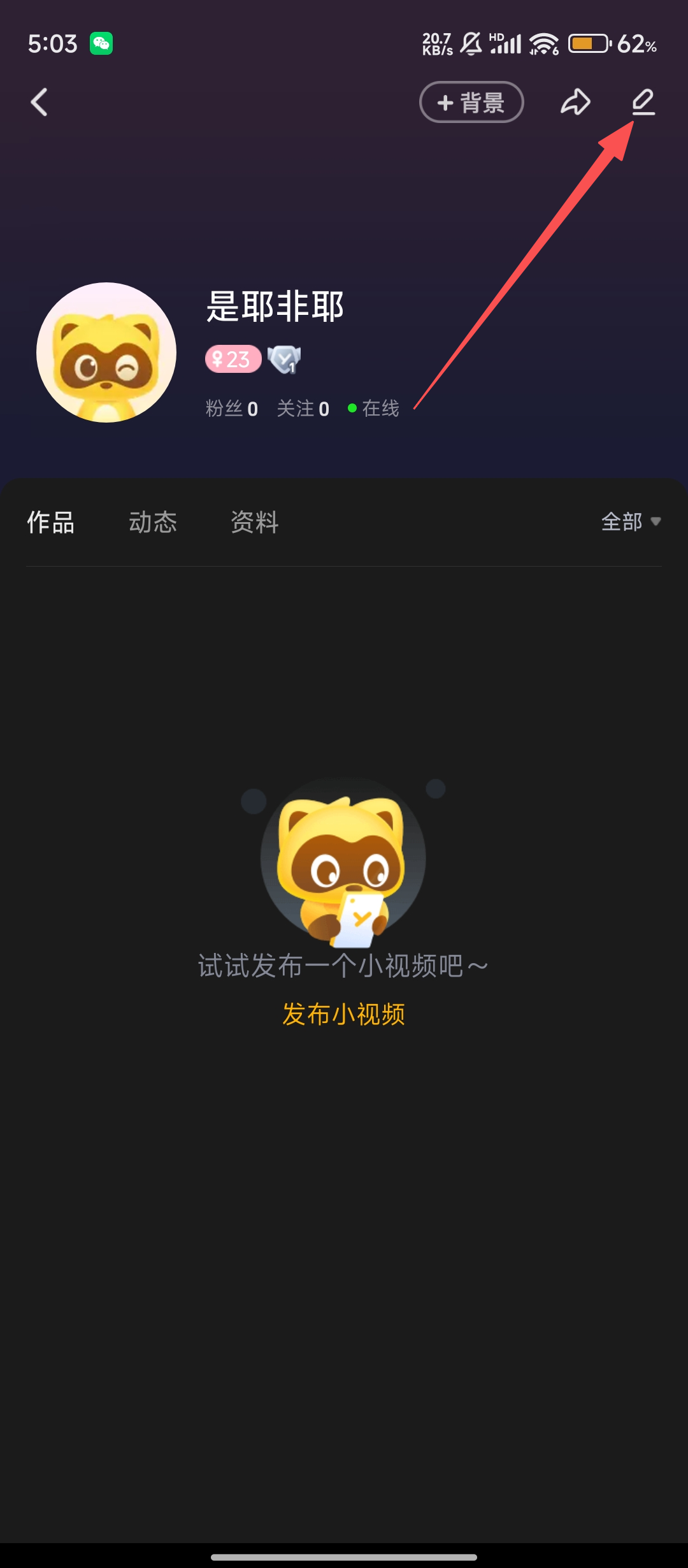 3、到个人主页后,点右上角的编辑图标,即可进入账号信息的修改界面哟。