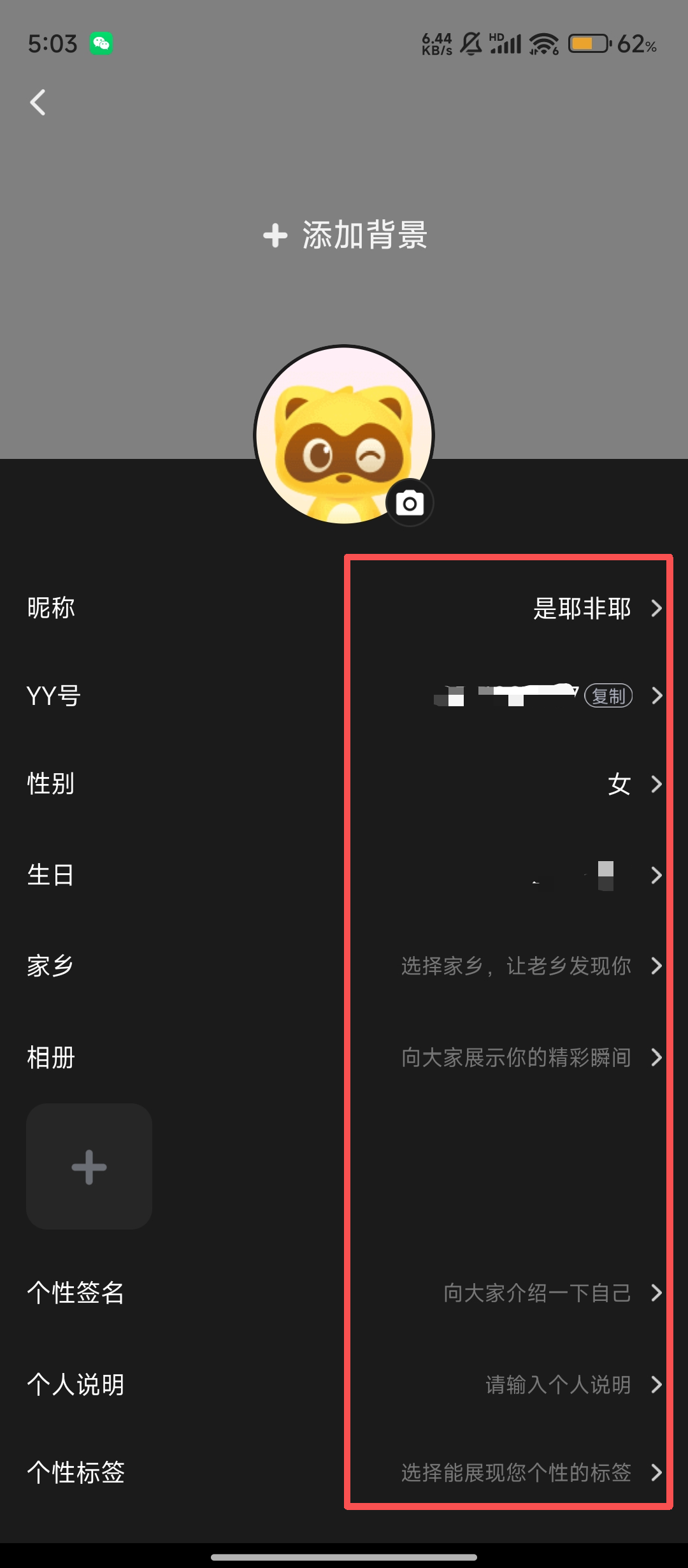 4、在编辑页面,可修改【昵称】、【YY号】等信息,轻松完成账号修改,让你的账号更具个性呢。