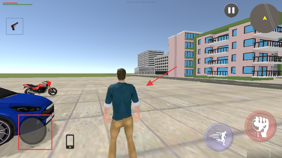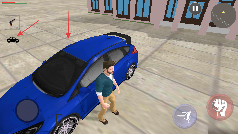 2、在场景中,借助左侧控制区域操控人物移动,朝着目标车辆(如蓝色汽车)靠近。
