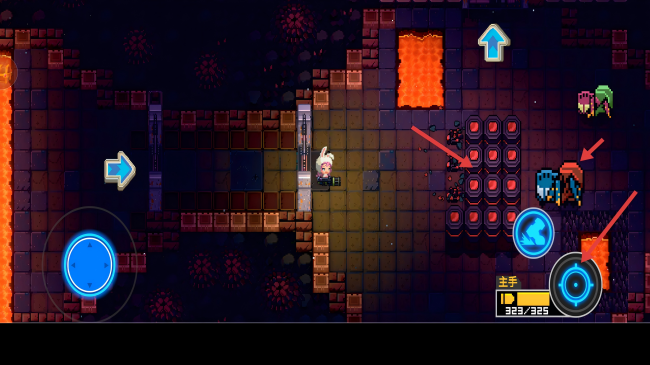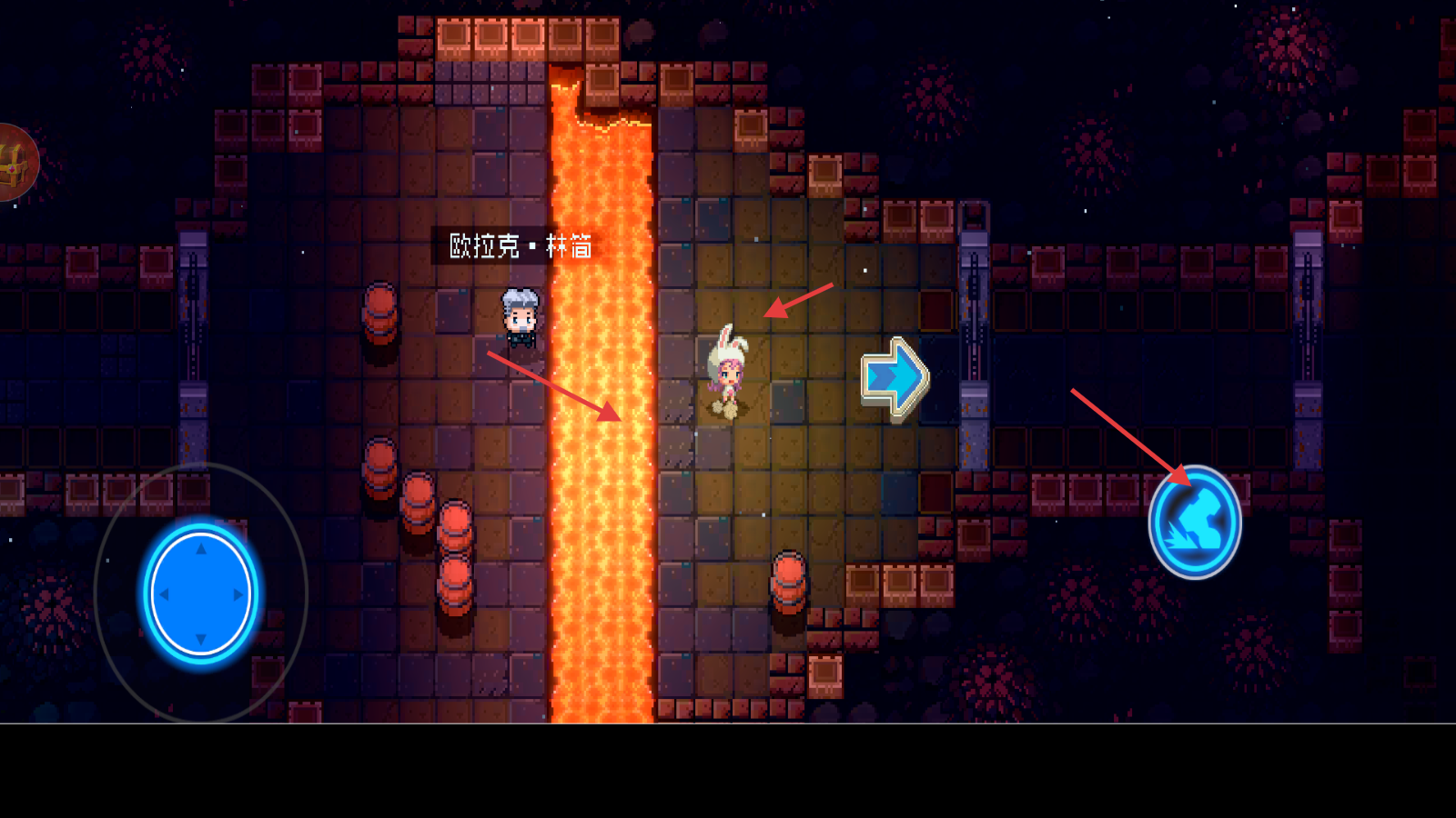 3、注意躲避场景中的岩浆等危险区域,可利用右侧技能按钮应对状况。