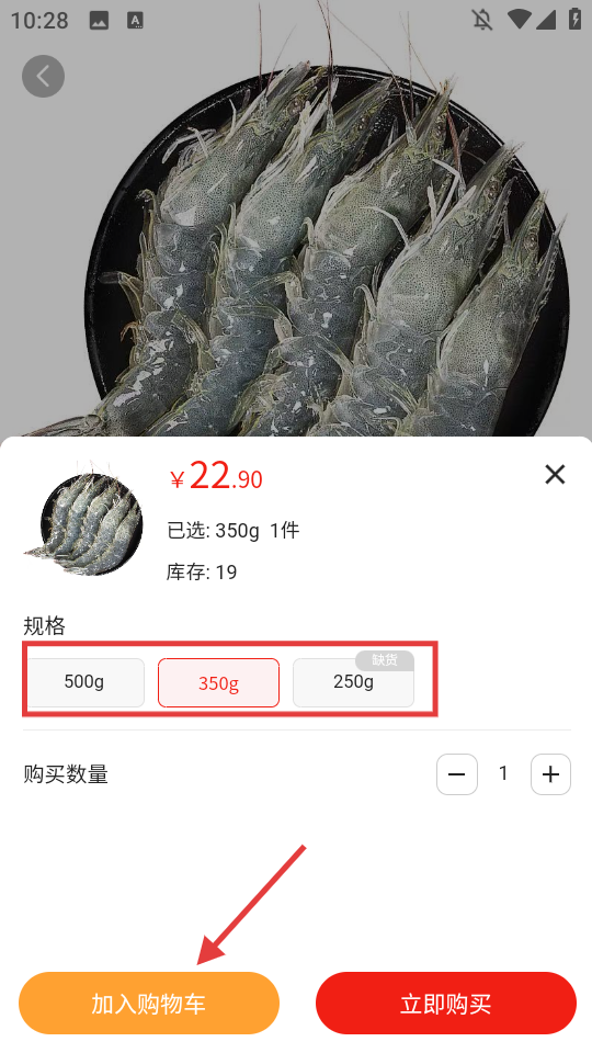 2、选择商品规格,确认后再次点击【加入购物车】。