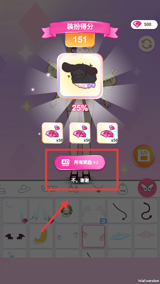 4、获得装扮得分后,可选择【AD所有奖励×2】或【不,谢谢】领取奖励。