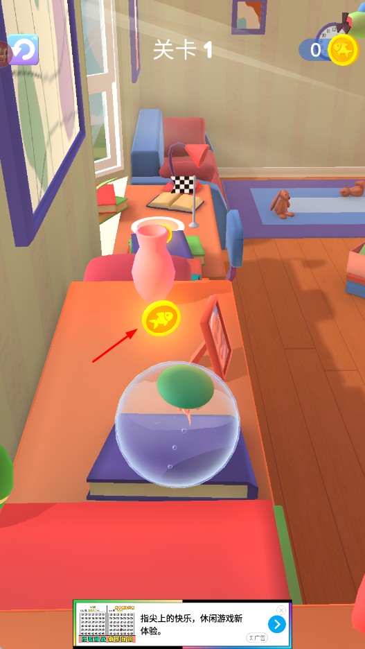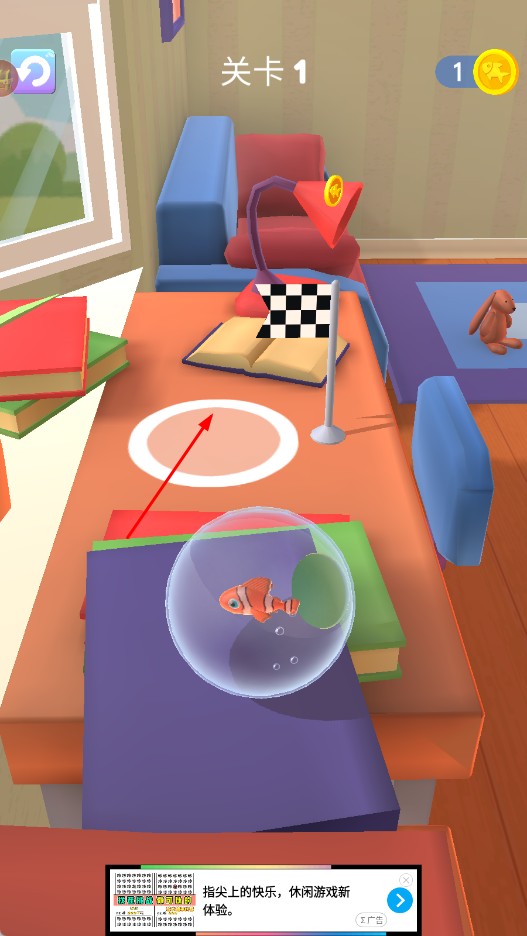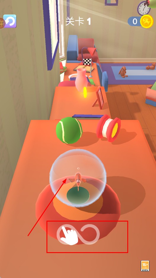 1、进入游戏【关卡1】,长按对应区域,操控带小鱼的透明球体移动。