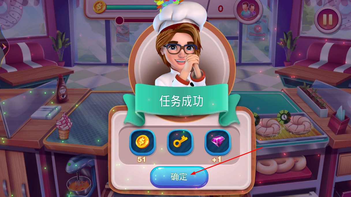 4、完成订单后,会显示【任务成功】,点击【确定】,领取金币、钥匙、钻石等奖励,开始下一关。