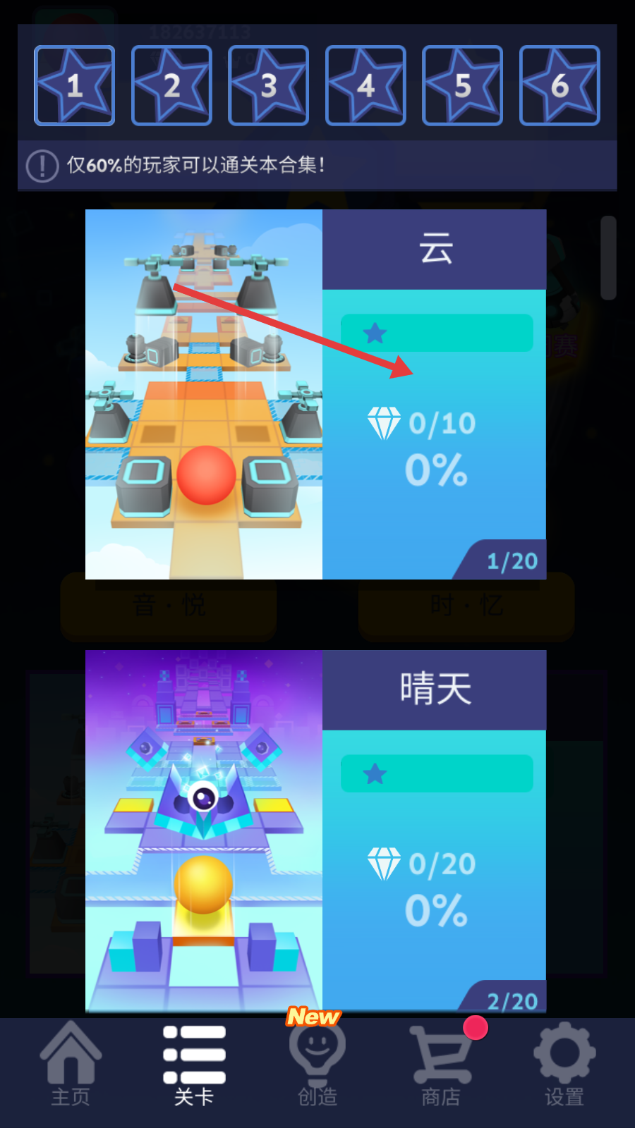 1、选择关卡,如“云”关卡,需收集10颗钻石通关。