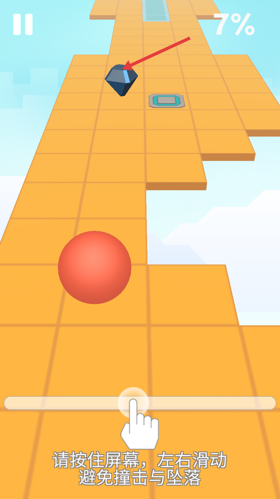 2、按住屏幕左右滑动,控制红球移动,收集钻石,避免撞击与坠落。