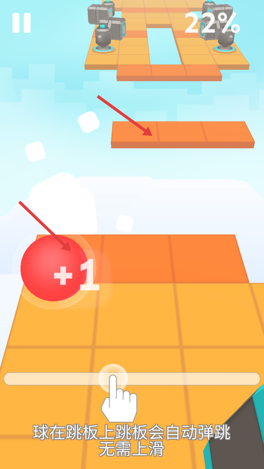 3、红球到跳板上时,跳板会自动弹跳,无需上滑操作。