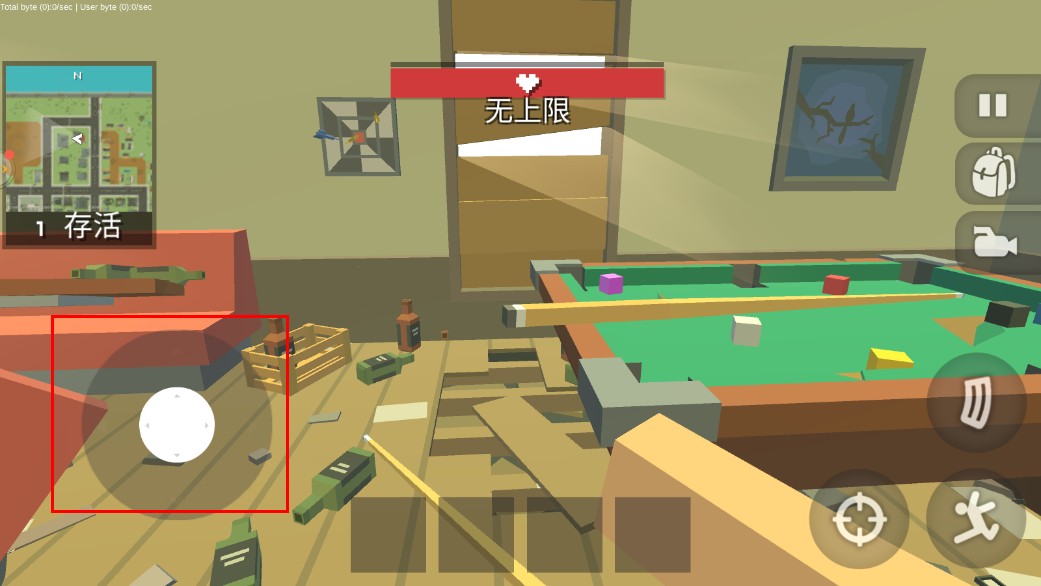 2、用左侧虚拟摇杆,操控角色在场景移动,探索房间、街道,搜集武器。
