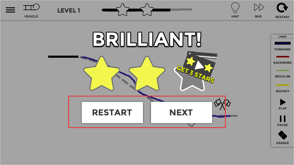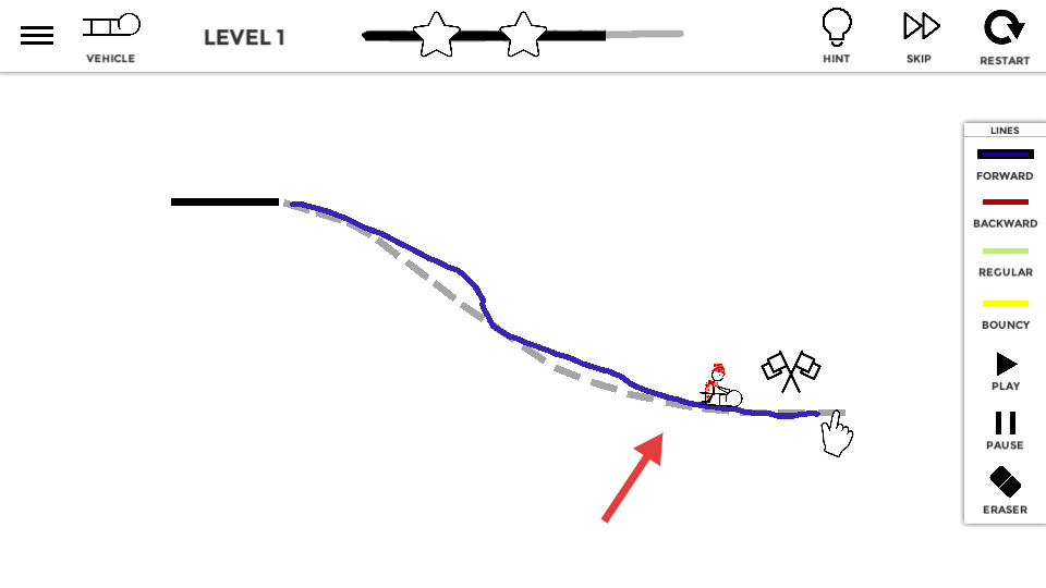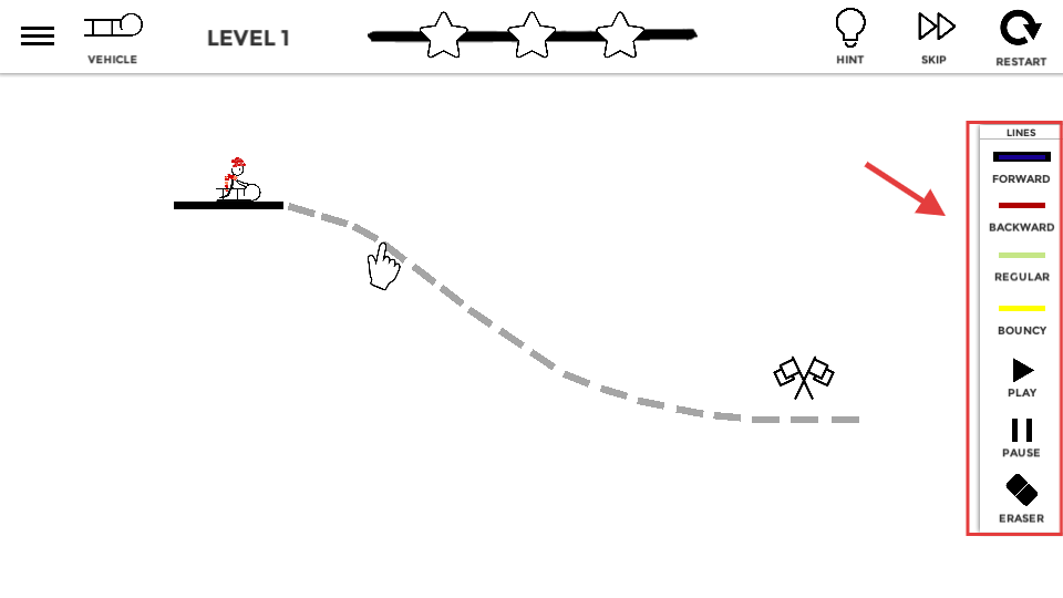 2、在【Level-1】关卡,右侧【LINES】栏选线条类型,按提示画小车行驶路径。