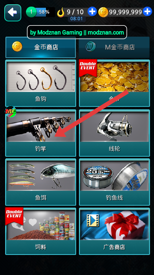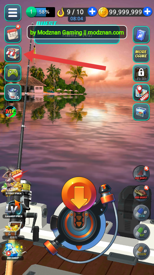 1、点击左侧【Shop】按钮,进入商店界面,利用无限金币资源选购钓鱼装备。