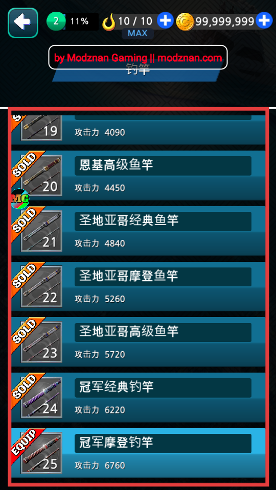 3、优先选购高攻击力的钓竿,如【冠军摩登钓竿】,攻击力达6760,助力钓起稀有鱼类。