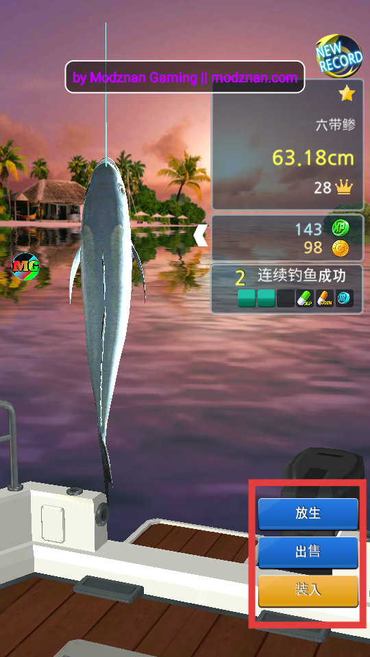 4、钓到鱼后,可选择【出售】获取金币和经验,或【装入】收藏,也可【放生】,根据需求操作以积累资源。