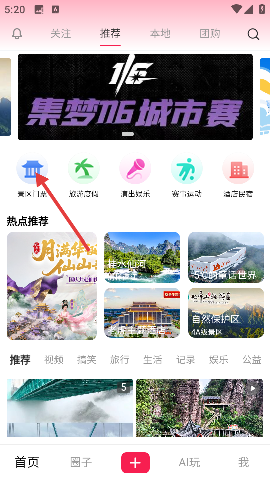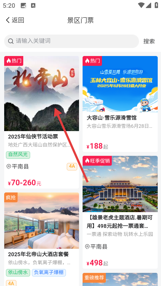 1、打开APP,在首页点击【景区门票】图标,进入景区门票页面。