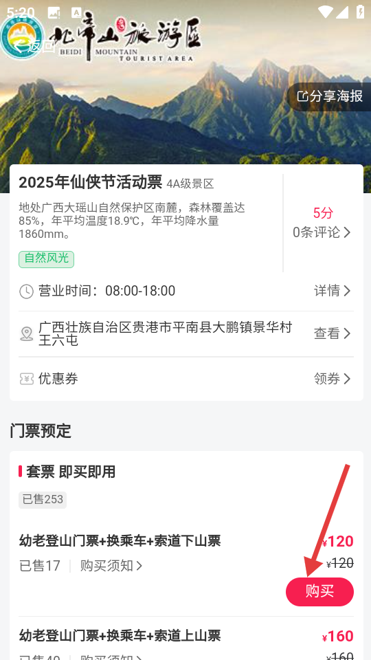 3、在景区门票详情页,选择要购买的门票类型,点击【购买】按钮。