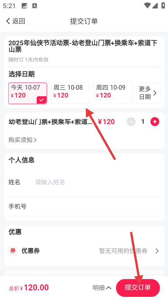 4、进入提交订单页面,选择日期,填写个人信息,确认总价后点击【提交订单】,完成门票购买流程。