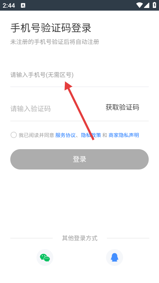 1、在“登录”页面,输入手机号,获取并输入验证码,点击【登录】,进入APP首页。