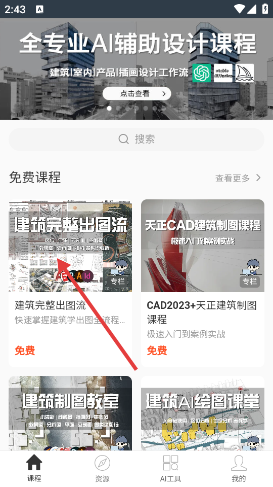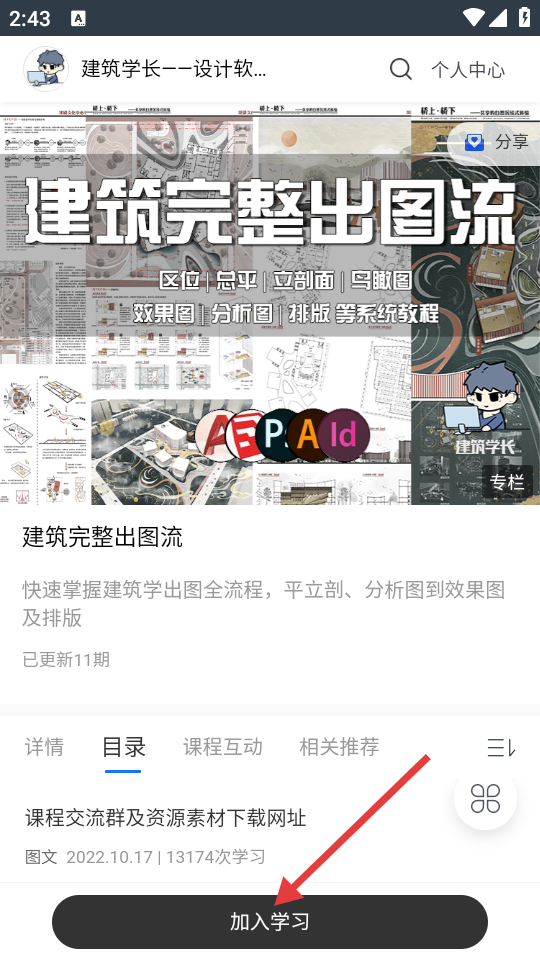 3、在课程页面,选择“建筑完整出图流”课程,进入该课程详情页面。