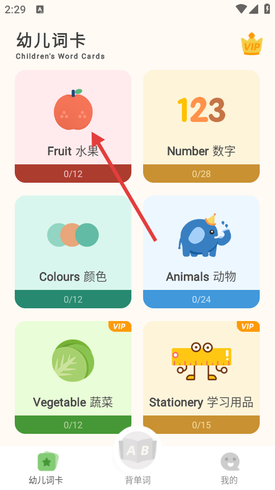 1、在“幼儿词卡”页面,点击【Fruit水果】选项。