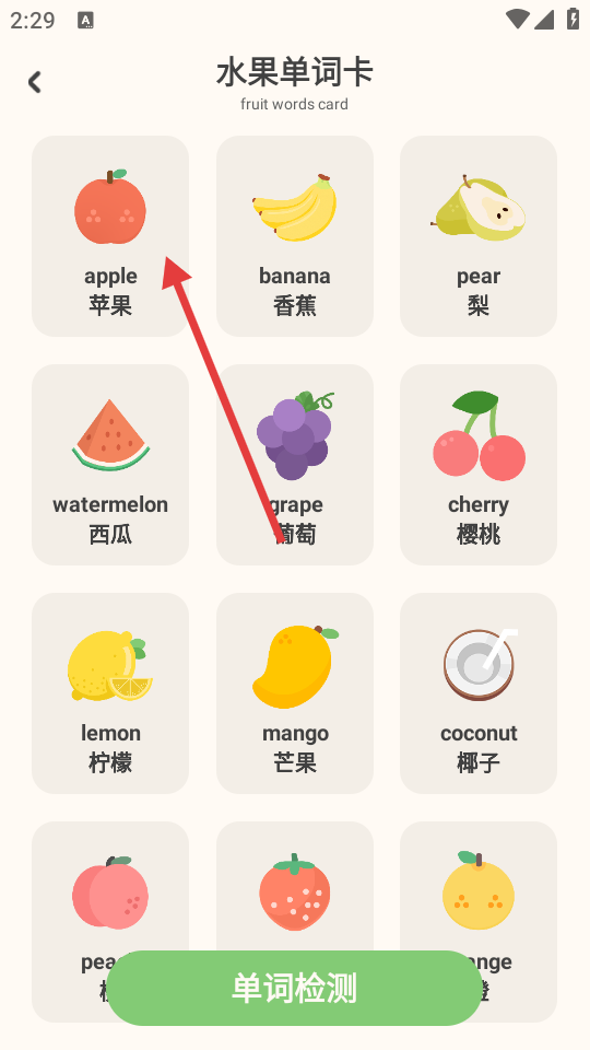 2、进入水果单词卡页面后,点击【apple苹果】选项。