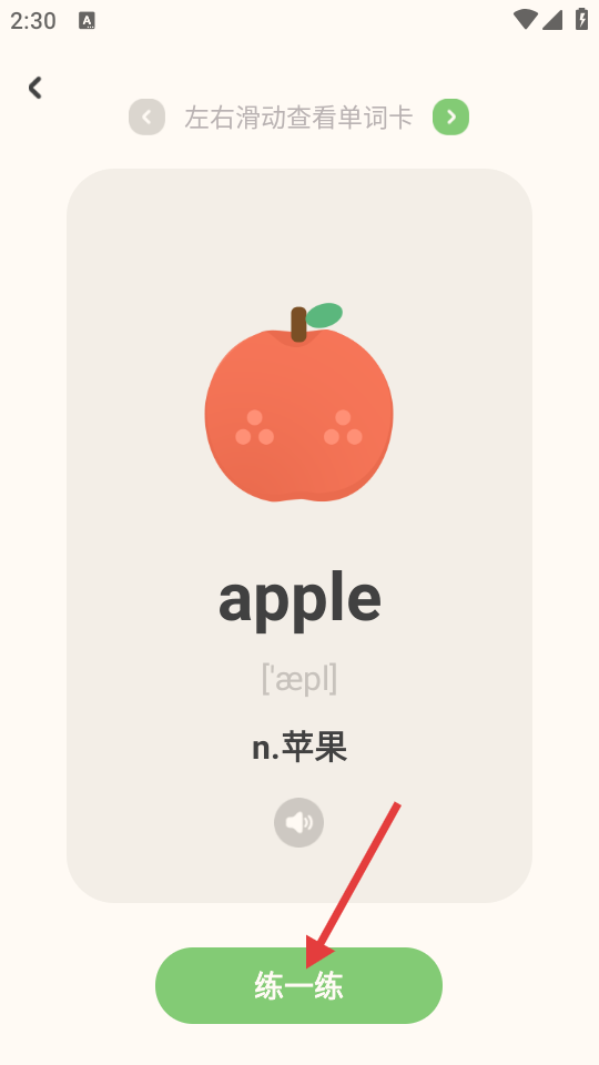 3、在“apple”单词卡页面,点击【练一练】按钮。