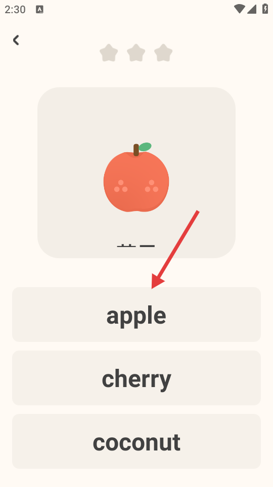 4、进入练习页面后,根据展示的水果图片,选择正确的单词。