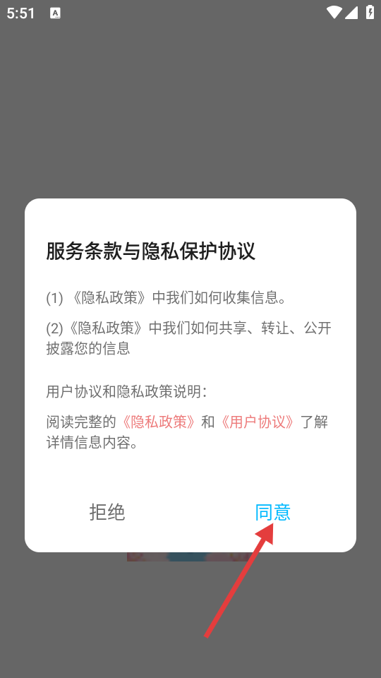 1、在“服务条款与隐私保护协议”弹窗中,点击【同意】按钮。