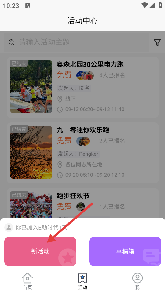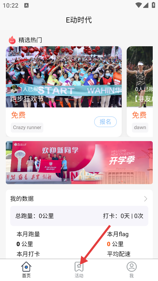 1、进入【E动时代】APP首页,点击底部【活动】。