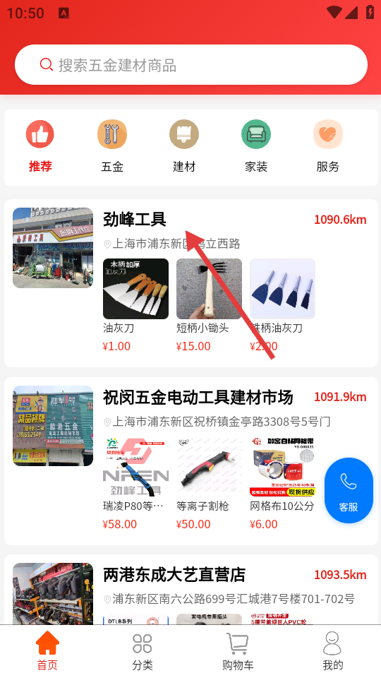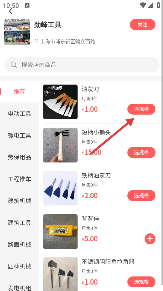 1、进入APP首页,选择想要的店铺(如“劲峰工具”)。