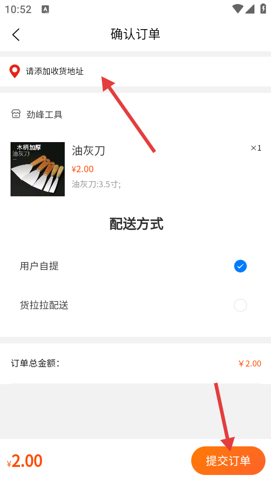 4、在确认订单页面,添加收货地址、选择配送方式,点击【提交订单】。