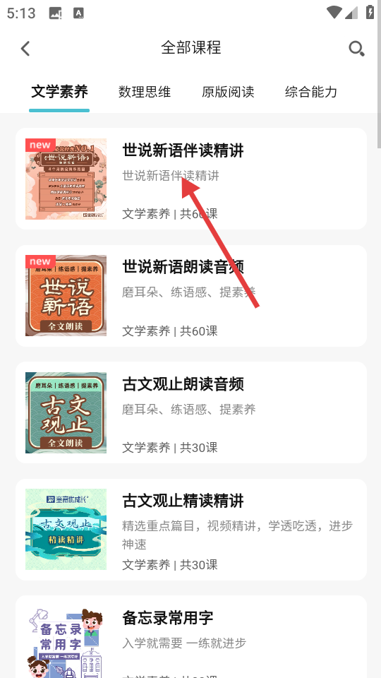 2、在全部课程页面,选择想要学习的课程(如“世说新语伴读精讲”)。