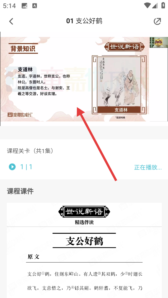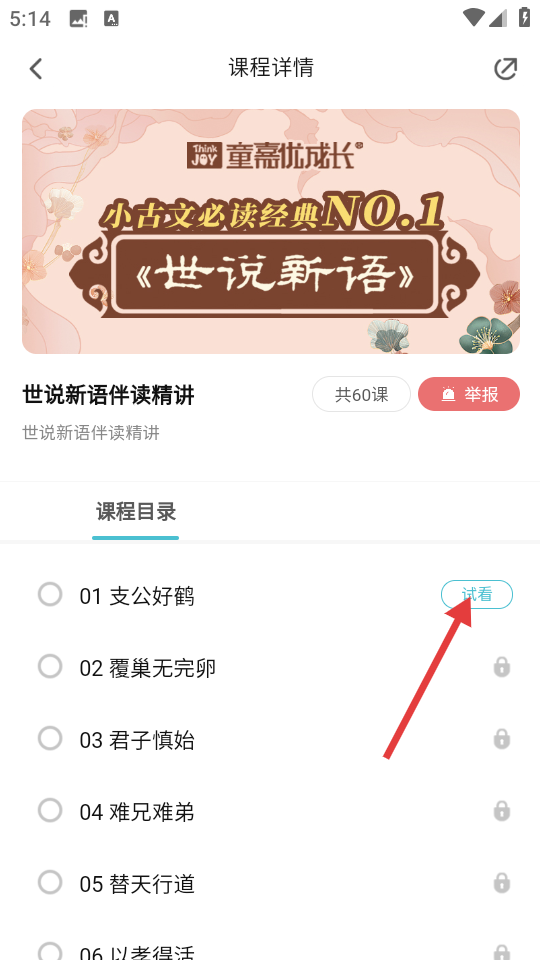 3、进入课程详情页,点击课程章节(如“01支公好鹤”)旁的【试看】。