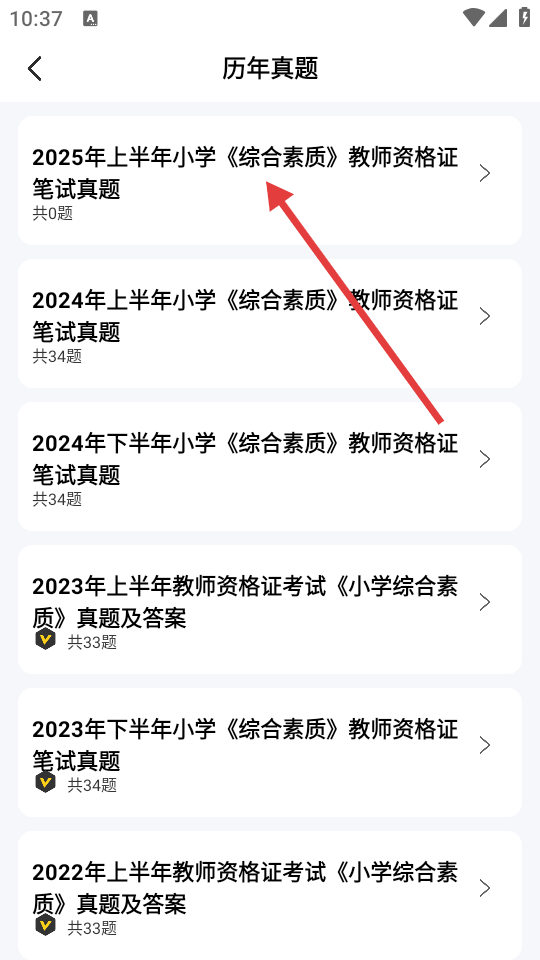1、在APP的题库页面,点击【历年真题】进入真题列表界面。