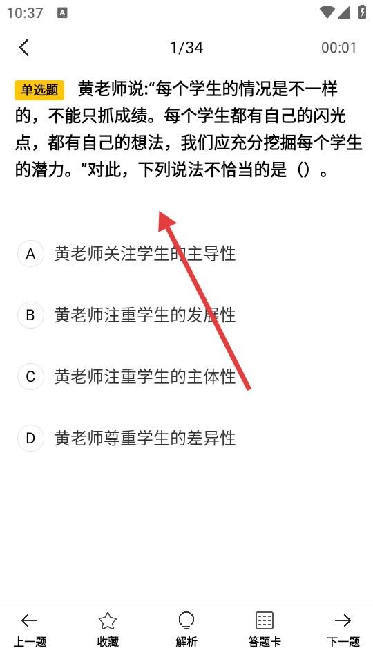 3、在真题作答页面,完成如单选题等题目作答,可使用收藏、解析等功能辅助答题。