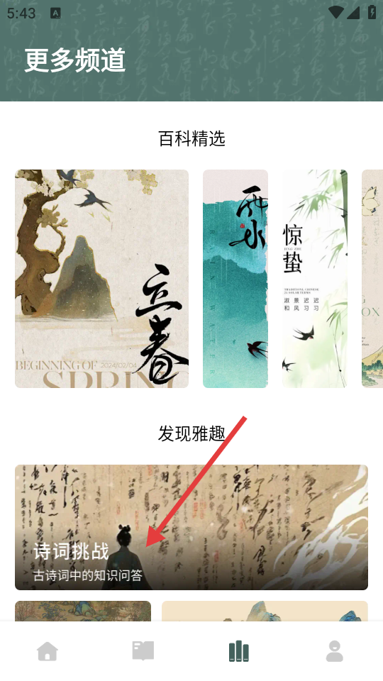 2、在更多频道中找到【诗词挑战】板块,点击进入。
