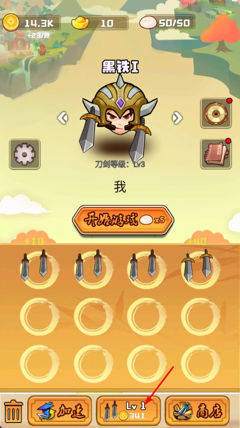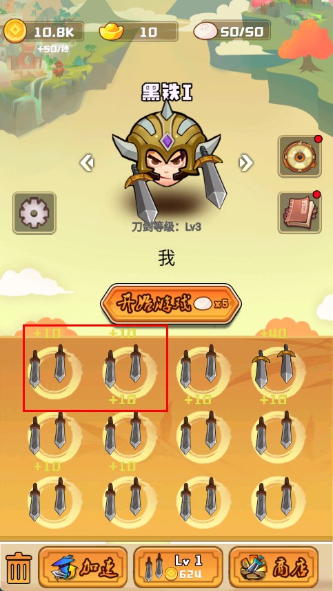 2、在下方刀剑配置区域,选择并合并放置刀剑,提升战力。