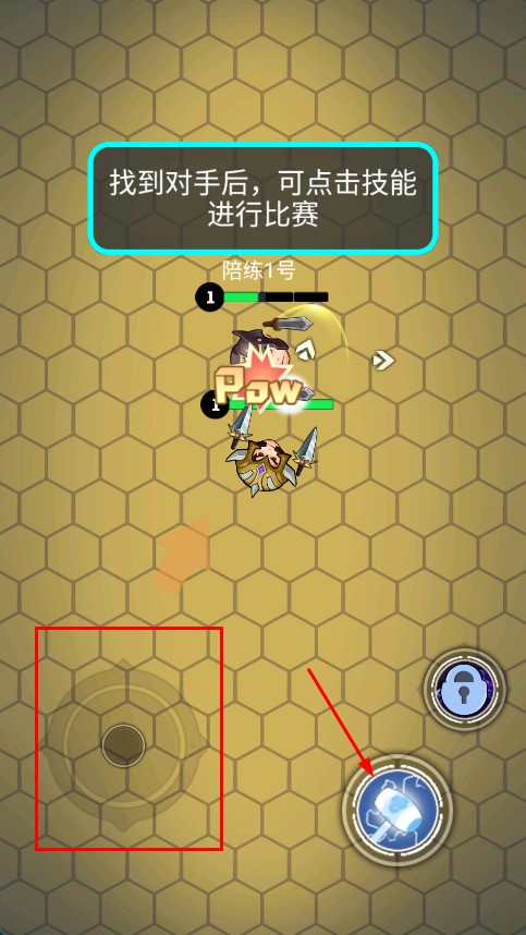 4、找到对手后,用左侧虚拟摇杆操控角色移动,点击右侧技能按钮释放技能,与对手比赛。