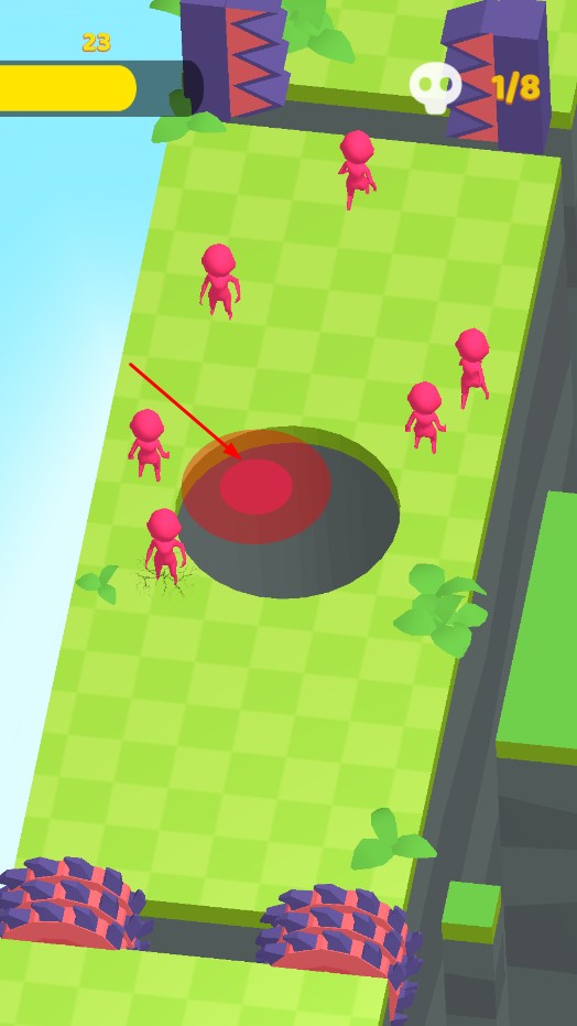 2、操控红色光圈,吸附周围粉色小人将其推入黑洞。