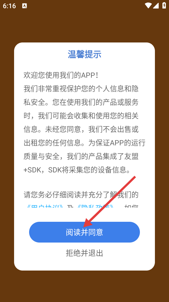 1、在温馨提示弹窗中,点击【阅读并同意】按钮,进入首页。