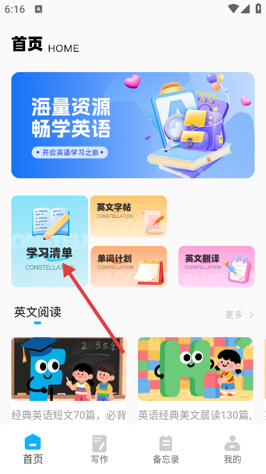 2、在首页,点击【学习清单】选项,进入计划清单页面。