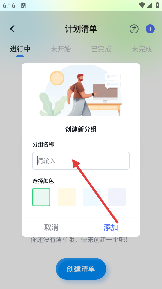 4、在创建新分组弹窗中,输入分组名称,选择颜色后,点击【添加】按钮,完成清单分组的创建。