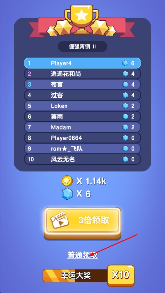 4、排位结束后,点击【普通领取】按钮,获取奖励。